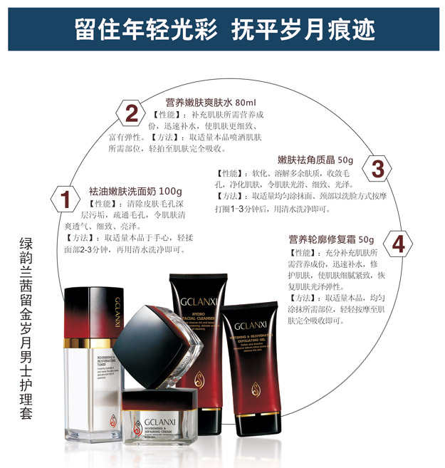 TIPS:留金歲月男士護(hù)理套裝適合干性、中性的男性皮膚使用。能深層清除污垢、補(bǔ)充養(yǎng)分,迅速補(bǔ)水,軟化、溶解老化壞死細(xì)胞,凈化肌膚;補(bǔ)充養(yǎng)分和水分,修護(hù)肌膚,恢復(fù)彈性。