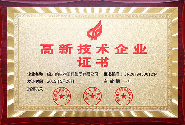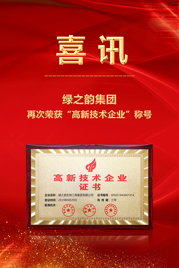 近日,根據(jù)全國高新技術(shù)企業(yè)認(rèn)定管理工作領(lǐng)導(dǎo)小組辦公室公示的《關(guān)于湖南省 2019年第二批高新技術(shù)企業(yè)備案的復(fù)函》(國科火字{2019}218號)文件。綠之韻集團(tuán)再度榮獲“高新技術(shù)企業(yè)”稱號,證書編號:GR201943001214。該資證由湖南省科學(xué)技術(shù)廳、湖南省財政廳、國家稅務(wù)總局湖南省稅務(wù)局聯(lián)合批準(zhǔn)頒發(fā),有效期為三年。
