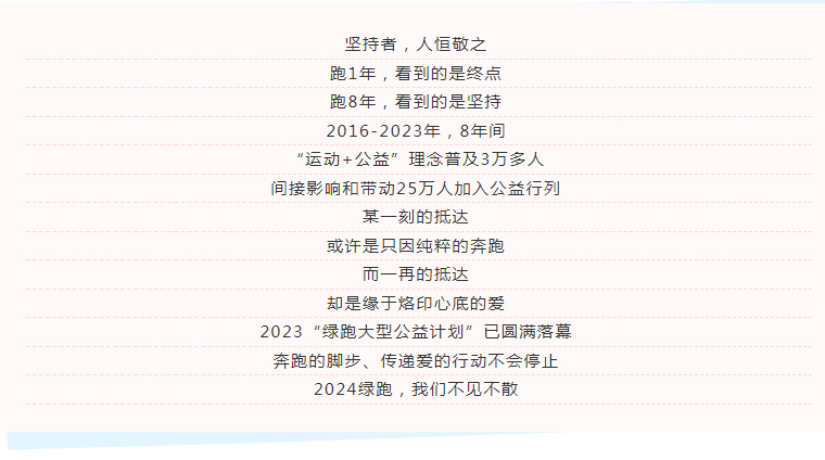 時(shí)間推移,初心不變,在歷史的長(zhǎng)河里,二十年轉(zhuǎn)瞬即逝;但所有走過(guò)的路,都必留下痕跡。對(duì)于20歲的綠之韻而言,二十年里有太多值得記取的瞬間,我們和所有公益同行者所奉獻(xiàn)的公益和大愛,都將永不停步。站在新的起點(diǎn)上,感謝所有與我們一路同行的公益力量,感謝公益事業(yè)的管理者、捐助者、參與者、倡導(dǎo)者、傳播者。下一個(gè)二十年,綠之韻期待和所有關(guān)心公益事業(yè)的人一起,用更多愛心與善意溫暖這個(gè)世界。