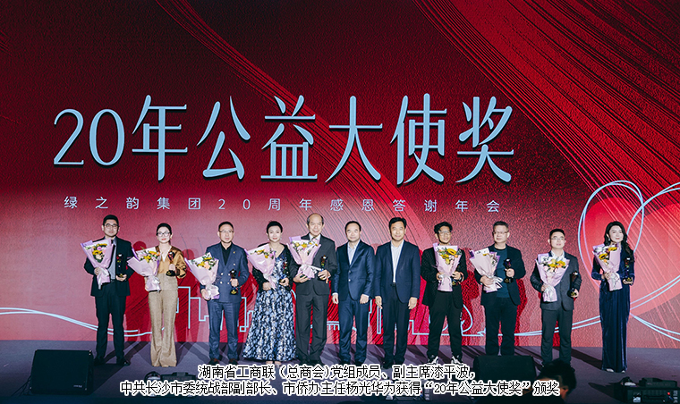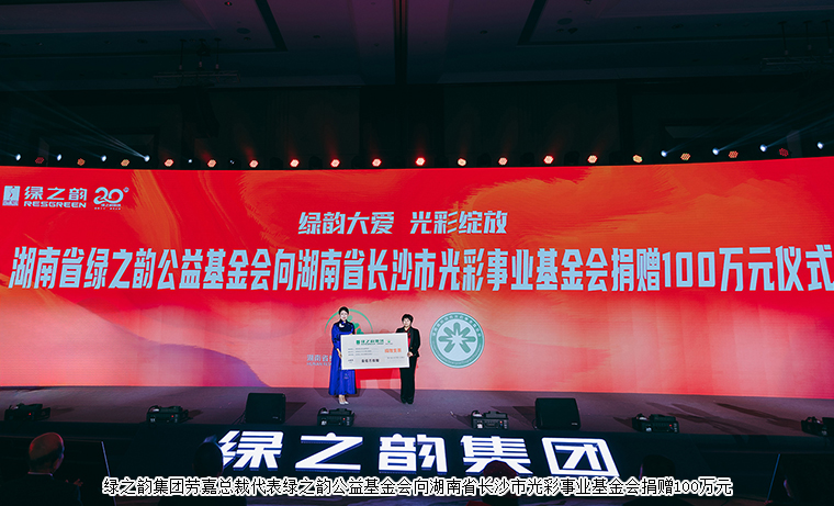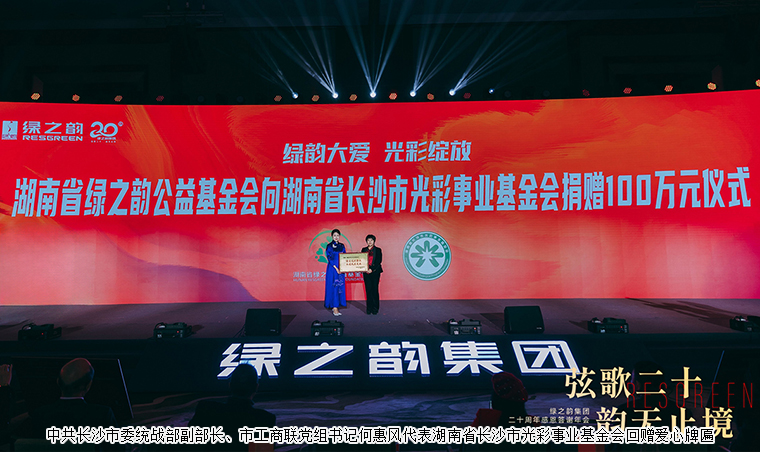 馭時而進(jìn),廿載逐光;回溯往昔,心懷感恩;繼往開來,至臻致遠(yuǎn)。創(chuàng)立20年來,綠之韻積極承擔(dān)企業(yè)公民責(zé)任,熱心公益事業(yè)。公益路上,綠之韻的事業(yè)伙伴中也涌現(xiàn)出眾多的向善向上的力量,瑞僖金融、綠之韻三十九鋪、云來科技、綠之韻低碳、綠之韻碧波庭、綠之韻數(shù)字化健康科技、綠之韻幸福國際、綠之韻微看等憑借積極投身公益獲得綠之韻“20年公益大使獎”。湖南省工商聯(lián)(總商會)黨組成員、副主席漆平波,中共長沙市委統(tǒng)戰(zhàn)部副部長、市僑辦主任楊光華上臺為獲得者頒獎。晚會現(xiàn)場,勞嘉理事長代表綠之韻公益基金會向湖南省長沙市光彩事業(yè)基金會捐贈100萬元愛心支票,中共長沙市委統(tǒng)戰(zhàn)部副部長、市工商聯(lián)黨組書記何惠風(fēng)向綠之韻公益基金會回贈愛心牌匾。該筆愛心善款將用于鄉(xiāng)村振興、幫扶濟(jì)困等光彩事業(yè),為需要幫助的人送去溫暖和希望。