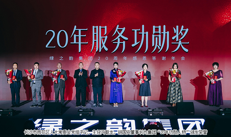 在集團(tuán)二十年的發(fā)展歷程中,有這樣一群人,他們與綠之韻同成長,共發(fā)展,始終保持著創(chuàng)業(yè)激情、創(chuàng)新的精神,他們深諳企業(yè)經(jīng)營之道,是推動綠之韻業(yè)績增長的主力軍,是踐行商業(yè)模式創(chuàng)新的先驅(qū)者,是打造高效團(tuán)隊的實踐者。綠之韻集團(tuán)董事長胡國安、長沙市雨花區(qū)人大常委會黨組書記、主任馮聰龍上臺為集團(tuán)“20年功勛人物”頒發(fā)榮譽。