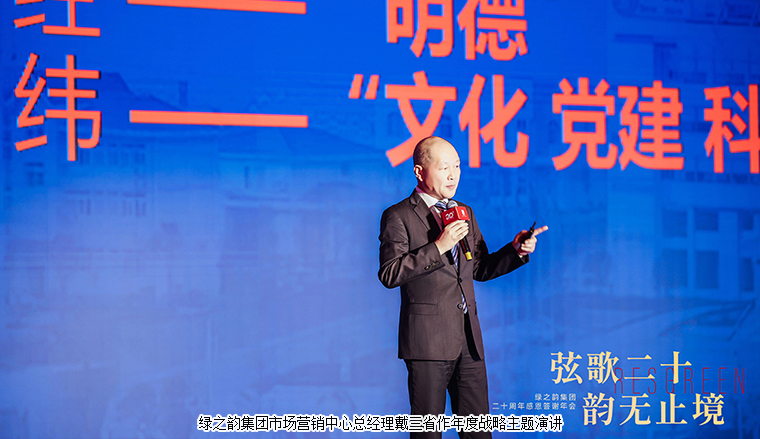 會上,綠之韻集團(tuán)市場營銷中心總經(jīng)理戴三省作戰(zhàn)略主題演講。他以“三個不改變”為指導(dǎo)思想,以綠之韻集團(tuán)第四個五年規(guī)劃為依據(jù),向與會嘉賓描繪了一幅由明德、親民、至善三條“經(jīng)線”與文化、黨建、科研、產(chǎn)品、服務(wù)、升級、公益、稅收、就業(yè)為九條“緯線”交織而成的宏偉畫面,深入淺出地向大家展示了綠之韻集團(tuán)“三經(jīng)九緯”的戰(zhàn)略布局。