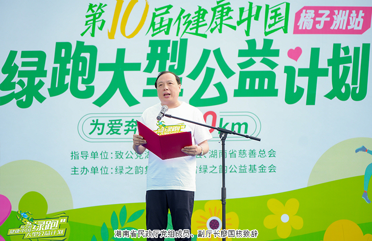 湖南省民政廳黨組成員、副廳長廖國核致辭。他表示,今天,我們相聚在橘子洲,參與第10屆綠之韻“健康中國-綠跑大型公益活動,共同見證湖南省綠之韻公益基金會成立10周年。他代表湖南省民政廳、湖南省慈善總會,向每一位心懷赤誠的參賽選手致以問候,向深耕公益的綠之韻集團(tuán)表示誠摯感謝,向所有為湖湘慈善事業(yè)添磚加瓦的仁人志士致以崇高的敬意。公益是精神圖騰,慈善是心靈長跑。他表示,10年來,綠跑從松雅湖到湘江,從企業(yè)善意到30萬群眾參與,每一步都刷新公益溫度,丈量文明高度。綠之韻集團(tuán)22年堅持將公益融入企業(yè)血脈,在扶危濟(jì)困等領(lǐng)域播撒希望。綠跑活動10年捐贈款物近3000萬元,吸引3萬人參與,輻射超30萬人次。湖南省綠之韻公益基金會10年來組織了400多場公益活動,捐贈款物9100多萬,彰顯了企業(yè)擔(dān)當(dāng),詮釋了湖湘精神。