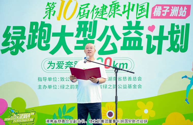 湖南省慈善總會副會長、綠之韻集團(tuán)董事長胡國安致歡迎辭。他首先代表綠之韻集團(tuán)及公益基金會,向蒞臨本次活動的領(lǐng)導(dǎo)嘉賓、媒體朋友、跑步愛好者,以及來自全國各地的家人們致以最熱烈的歡迎;向10年來風(fēng)雨同路的5.20公里踐行者,向所有投身公益的愛心企業(yè)、市民朋友,致以崇高的敬意和誠摯的感謝。他表示,今年公益綠跑的主題是“10放活力 益起上場”?!?0”既是綠跑舉辦10屆的里程碑,更是綠之韻公益基金會成立10周年的見證。2023年,綠之韻投入1000萬元啟動了“圓夢行動”公益項目。本屆綠跑,我們將繼續(xù)推進(jìn)“圓夢行動”公益項目,與湖南省慈善總會、芒果TV芒果公益平臺、長沙市彩虹殘疾人士服務(wù)中心、瀏陽市、安化縣等地多個單位簽訂圓夢結(jié)對幫扶協(xié)議,去幫助更多需要幫助的人。他祝愿,每一位綠跑選手都能取得好成績,愿今天的湘江碧波見證更多公益火種的播撒,愿我們攜手邁向更加健康、美好的明天!