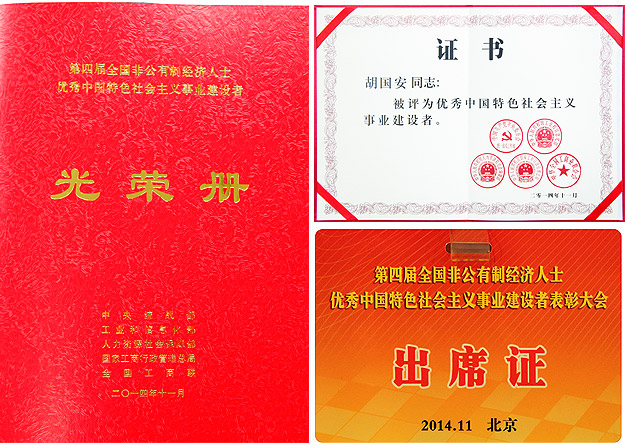 本次表彰大會由中央統(tǒng)戰(zhàn)部、工業(yè)和信息化部、人力資源和社會保障部、國家工商總局和全國工商聯(lián)共同舉辦。100名非公有制經(jīng)濟(jì)人士和其他新的社會階層人士受到表彰。自2003年創(chuàng)立綠之韻集團(tuán)以來,胡國安董事長堅(jiān)決擁護(hù)中國共產(chǎn)黨的領(lǐng)導(dǎo)和社會主義制度,擁護(hù)黨的路線、方針、政策,堅(jiān)定走中國特色社會主義道路,貫徹落實(shí)科學(xué)發(fā)展觀,企業(yè)管理制度完善、資質(zhì)質(zhì)量較高、財(cái)務(wù)狀況良好。黨、團(tuán)、工會組織健全并發(fā)揮了較好作用,做到愛國、敬業(yè)、誠信、守法、貢獻(xiàn),在本地區(qū)和同行業(yè)中起表率作用。同時,在以下某些方面表現(xiàn)突出:一是積極履行社會責(zé)任、安全生產(chǎn)、節(jié)能減排、保護(hù)環(huán)境、關(guān)愛員工、誠實(shí)守信以及參與光彩事業(yè)和社會公益事業(yè),支持和服務(wù)抗擊自然災(zāi)害;二是積極創(chuàng)立自主品牌和自主知識產(chǎn)權(quán)、發(fā)明專利、新產(chǎn)品開發(fā)、新技術(shù)推廣等;三是在企業(yè)文化建設(shè)、遵守社會公德和職業(yè)道德、追求和實(shí)踐大健康文明的生活方式、社會影響、社會形象等方面有著突出表現(xiàn)。
